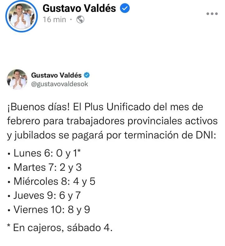 Este lunes, comienzo de la segunda semana del mes más corto del año, será el día en que inicie el cronograma de pago del Plus Unificado para trabajadores activos y también para jubilados provinciales según lo anunció el propio gobernador correntino.