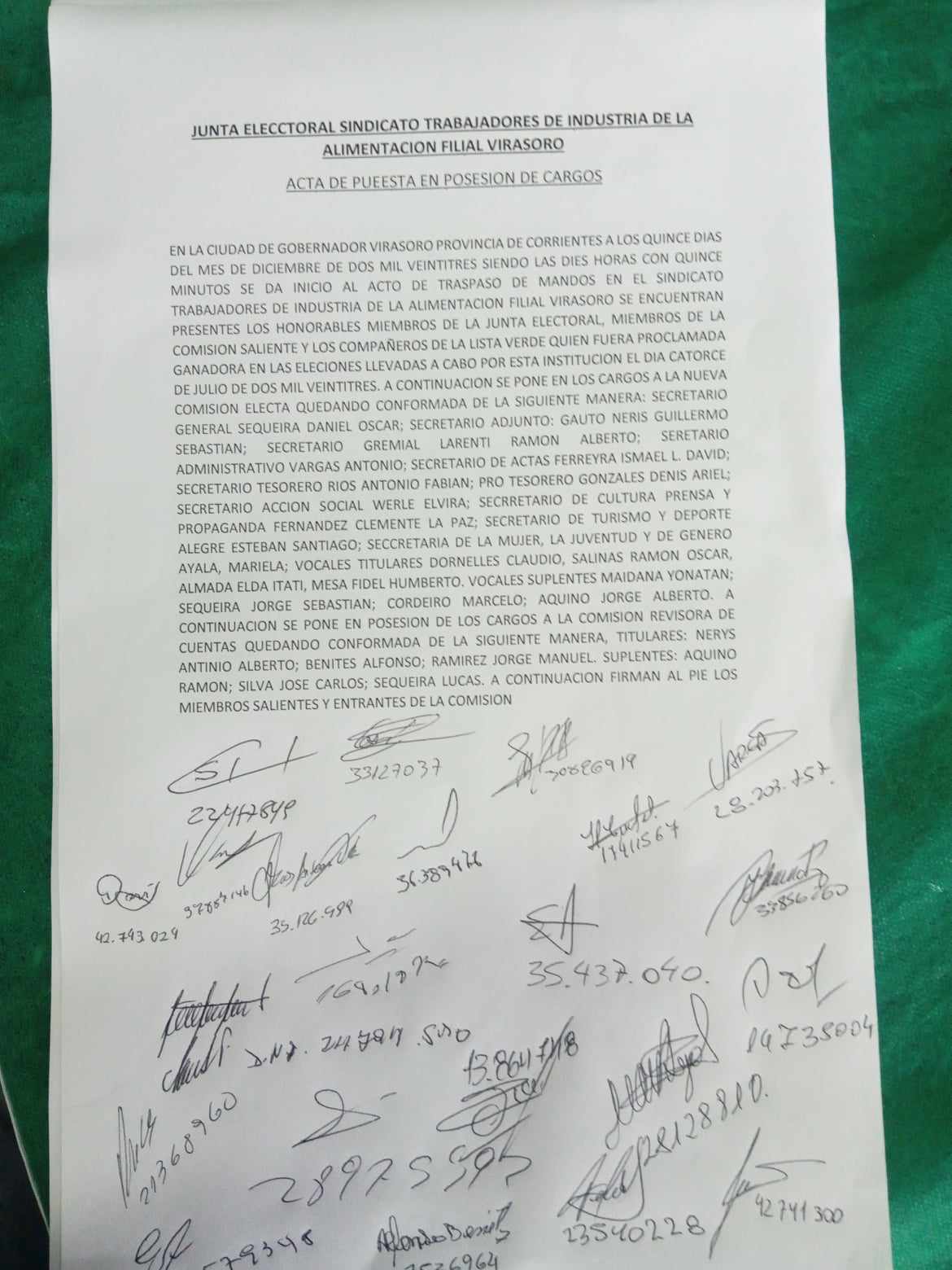 En horas de la mañana de este viernes 15 de diciembre, en la sede del Sindicato de la Industria de la Alimentación en Gdor. Virasoro, se llevó a cabo el acto en el cual asumieron las nuevas autoridades que el pasado 14 de julio fueran electas por la Lista Verde.