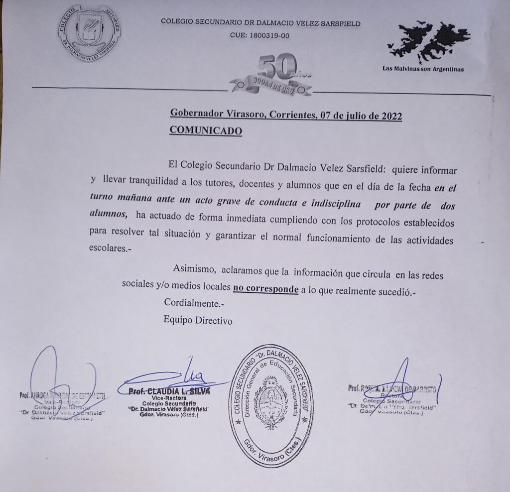 Autoridades del colegio difundieron un comunicado en el que describen la situación como “un acto grave de conducta e indisciplina…” y además dicen que lo publicado “no corresponde con lo que realmente sucedió”.