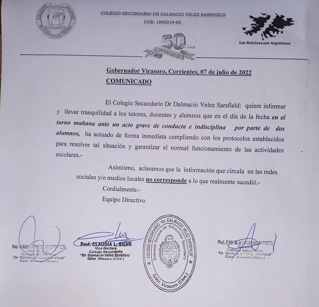 Autoridades del colegio difundieron un comunicado en el que describen la situación como “un acto grave de conducta e indisciplina…” y además dicen que lo publicado “no corresponde con lo que realmente sucedió”.