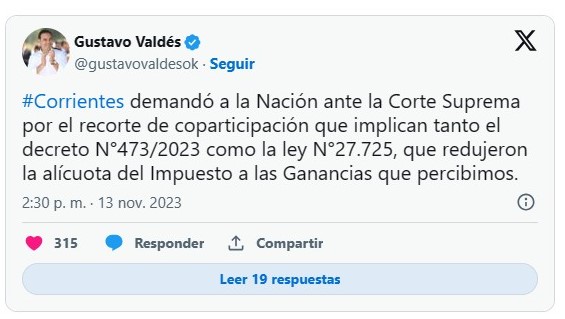 Gustavo Valdés, gobernador de Corrientes, anunció que demandó a la Nación frente a la Corte Suprema por el recorte de fondos de la coparticipación que implicó la reducción del cobro del impuesto a las ganancias a trabajadores.