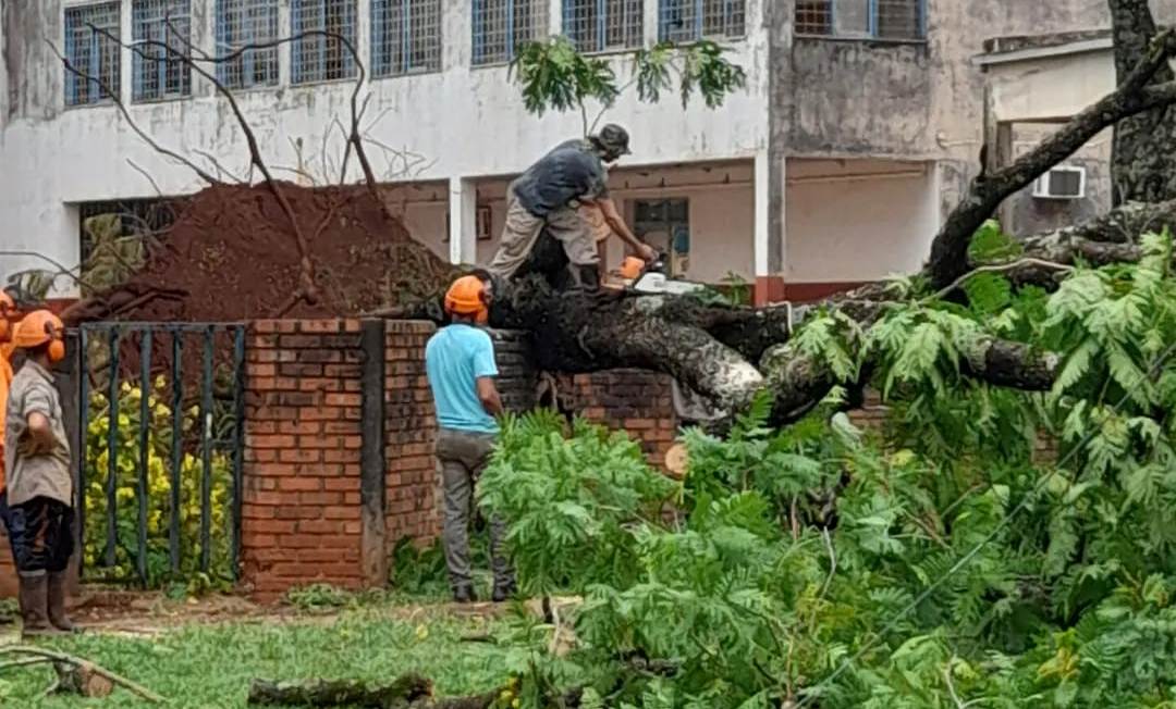 En este marco, en el predio de la Escuela 86, ubicada en los barrios INVICO al sur del casco céntrico de la ciudad, un árbol añoso y de gran porte cayó al ceder sus raíces a la fuerza del viento en su copa y tronco.