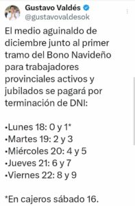 Valdés, confirmó este viernes el pago del aguinaldo y el primer tramo del bono navideño de 50 mil pesos para los estatales provinciales activos y jubilados.