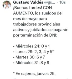 Hay expectativa entre los trabajadores activos y también los pasivos del Estado Provincial ante el anuncio del cronograma de pagos de haberes de Mayo, lo que sucederá desde éste 24 y se extenderá hasta el 31.