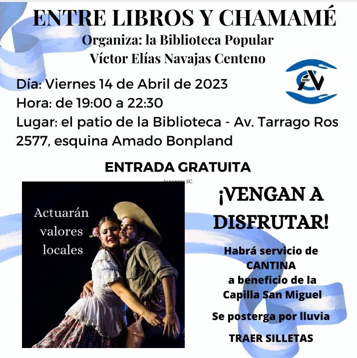 Es un regalo de la Biblioteca y de nuestros músicos a la comunidad. Entre libros y chamamé. Viernes 14 de abril, de 19 a 22.30 hs. Los esperamos! ….. Si llueve, agradeceremos al cielo y avisaremos qué pasa con el evento.