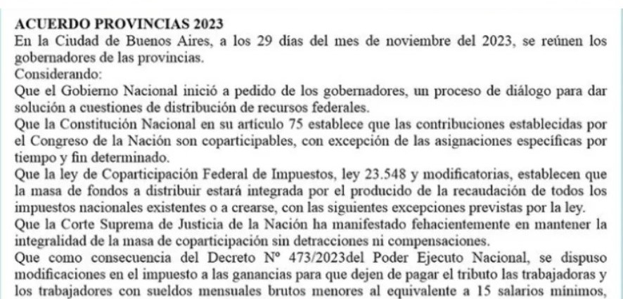 “El miércoles junto con gobernadores (actuales y electos, de distintos signos políticos) suscribimos un acta compromiso, bajo la convicción de que el federalismo argentino requiere de acuerdos conjuntos, en el marco de las autonomías provinciales orientadas al crecimiento económico y teniendo en cuenta que es necesario compensar la disminución de recursos producida por la modificación del impuesto a las ganancias, nos comprometemos a impulsar una ley que desafecte el 50% del Impuesto a los Débitos y Créditos Bancarios para que ingresen a la masa de Coparticipación Federal de Impuestos, Ley 23548 y sus modificatorias, a partir del 01 de enero del 2024”, escribió en sus redes sociales el gobernador de Santiago del Estero, Gerardo Zamora.