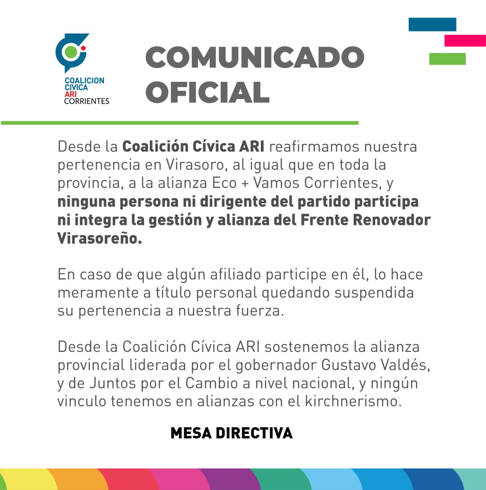 En un comunicado la Coalición Cívica y el ARI informaron que no tienen vinculación alguna con el Frente Renovador Virasoreño ni con el intendente de Virasoro Emiliano Fernández, aclarando que no tienen vínculos con alianzas que se encolumnan con el Kirchnerismo.