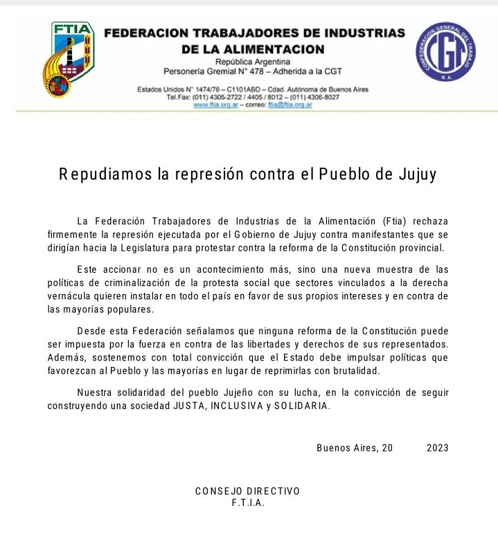 La Federación Trabajadores de Industrias de la Alimentación (Ftia) rechaza firmemente la represión ejecutada por el Gobierno de Jujuy contra manifestantes que se dirigían hacia la Legislatura para protestar contra la reforma de la Constitución provincial.