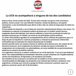 Antes del encuentro de gobernadores, se reunió el Comité Nacional de la Unión Cívica Radical y decidió que «no acompañará a ninguno de los candidatos» en el balotaje del 19 de noviembre en el que competirán por la presidencia Sergio Massa (Unión por la Patria) y Javier Milei (La Libertad Avanza), porque «ninguno de los dos garantiza un futuro de progreso para la Argentina».