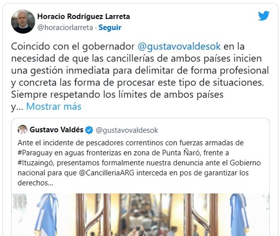 A través de su cuenta de Twitter, el precandidato a presidente por Juntos por el Cambio (JxC) Horacio Rodríguez Larreta se refirió al conflicto entre pescadores correntinos y la Armada paraguaya en Punta Ñaró.
