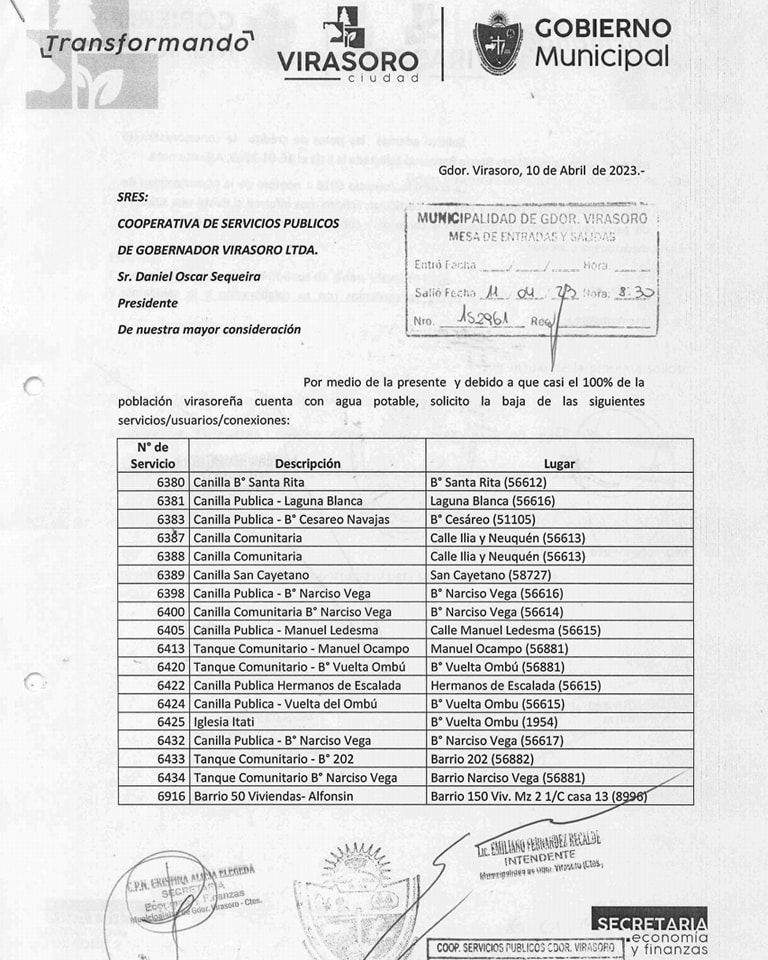 El municipio envió una Nota, la N° 152961 por medio de la cual solicita a la Cooperativa de Servicios Públicos que dé de baja a las canillas públicas cuyo listado se indican en la misiva. En base a esto la entidad prestataria se ve obligada a la baja de dichos dispensadores de agua a vecinos de bajos recursos.