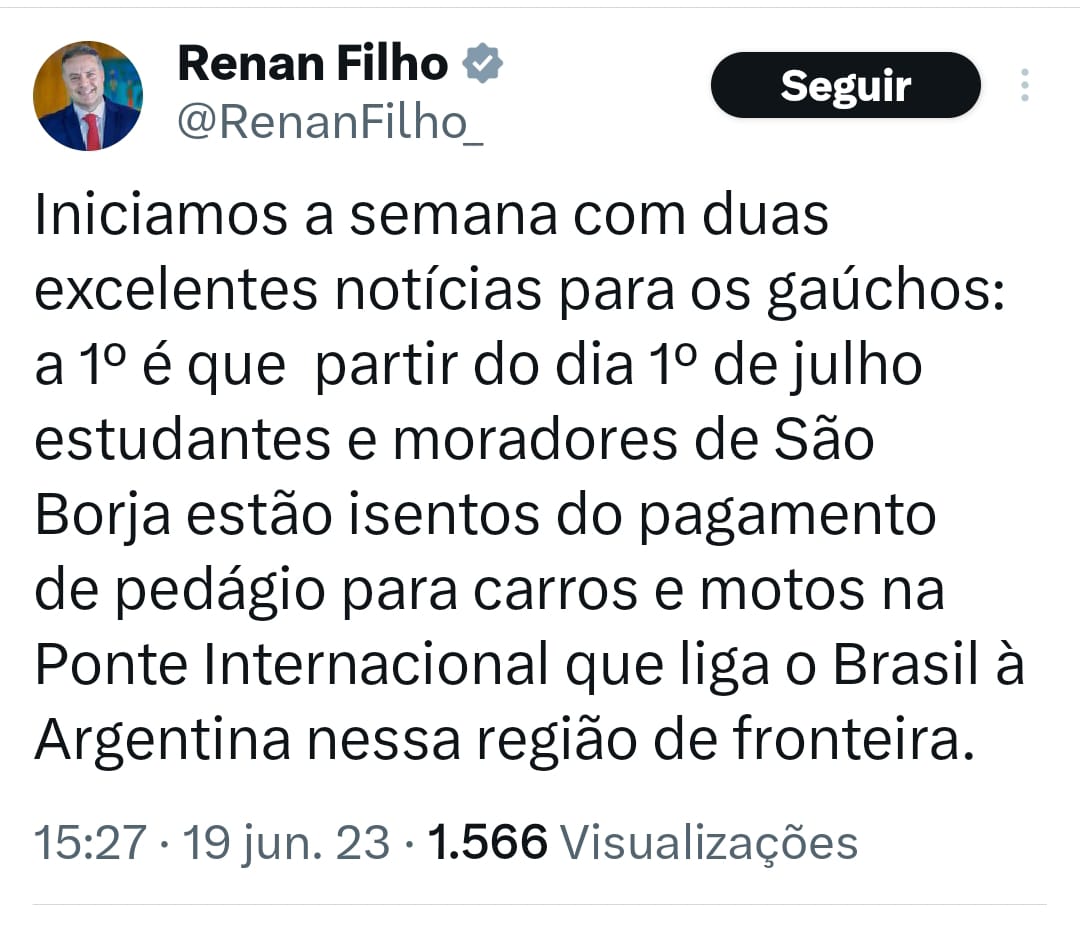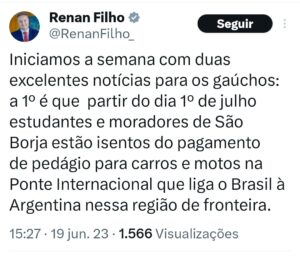 El propio Ministro de Transporte de Brasil, Renan Filho, Twiteó, «Iniciamos la semana con excelentes noticias: es que a partir del 1 de julio estudiantes y moradores de San Borja están exentos de pagar peaje con autos y motos en el puente internacional que conecta a Brasil con Argentina en esa región de la frontera».