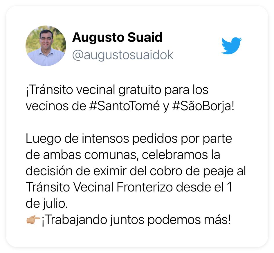 Por otra parte, desde la Municipalidad de Santo Tomé, el intendente José Augusto Suaid celebró la noticia: «Tránsito vecinal gratuito para vecinos de Santo Tomé y San Borja! Luego de intensos pedidos por parte de ambas comunas, celebramos la decisión de eximir del cobro de peaje al Tránsito Vecinal Fronterizo desde el 1 de julio», escribió en un Twitt.