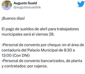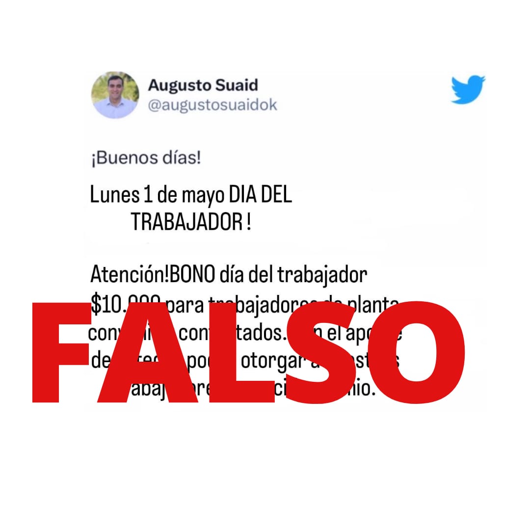 También se informó oficialmente que un supuesto Tweet de Suaid en el que se anunciaba un Bono de $ 10.000 para los empleados municipales por el día del trabajador, es “FALSO”, es un montaje.