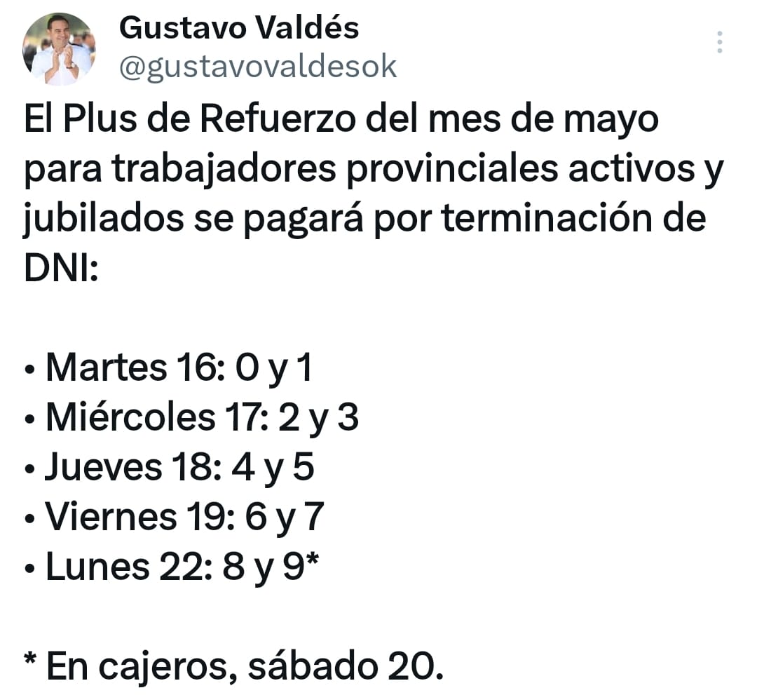 En tanto el segundo Plus de Mayo a los trabajadores del Estado Provincial dará comienzo este martes 16 y culminará el lunes 22, siempre de acuerdo a la terminación del DNI. (Ver Imagen).