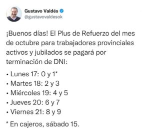 Continúa la liquidación del beneficio el martes 18, para los agentes con DNI terminados en 2 y 3. Mientras que el miércoles 19, percibirán los agentes con documentos finalizados en 4 y 5. El jueves 20, para aquellos con DNI terminados en 6 y 7; y el cronograma termina el viernes 21 con los documentos que finalizan en 8 y 9.