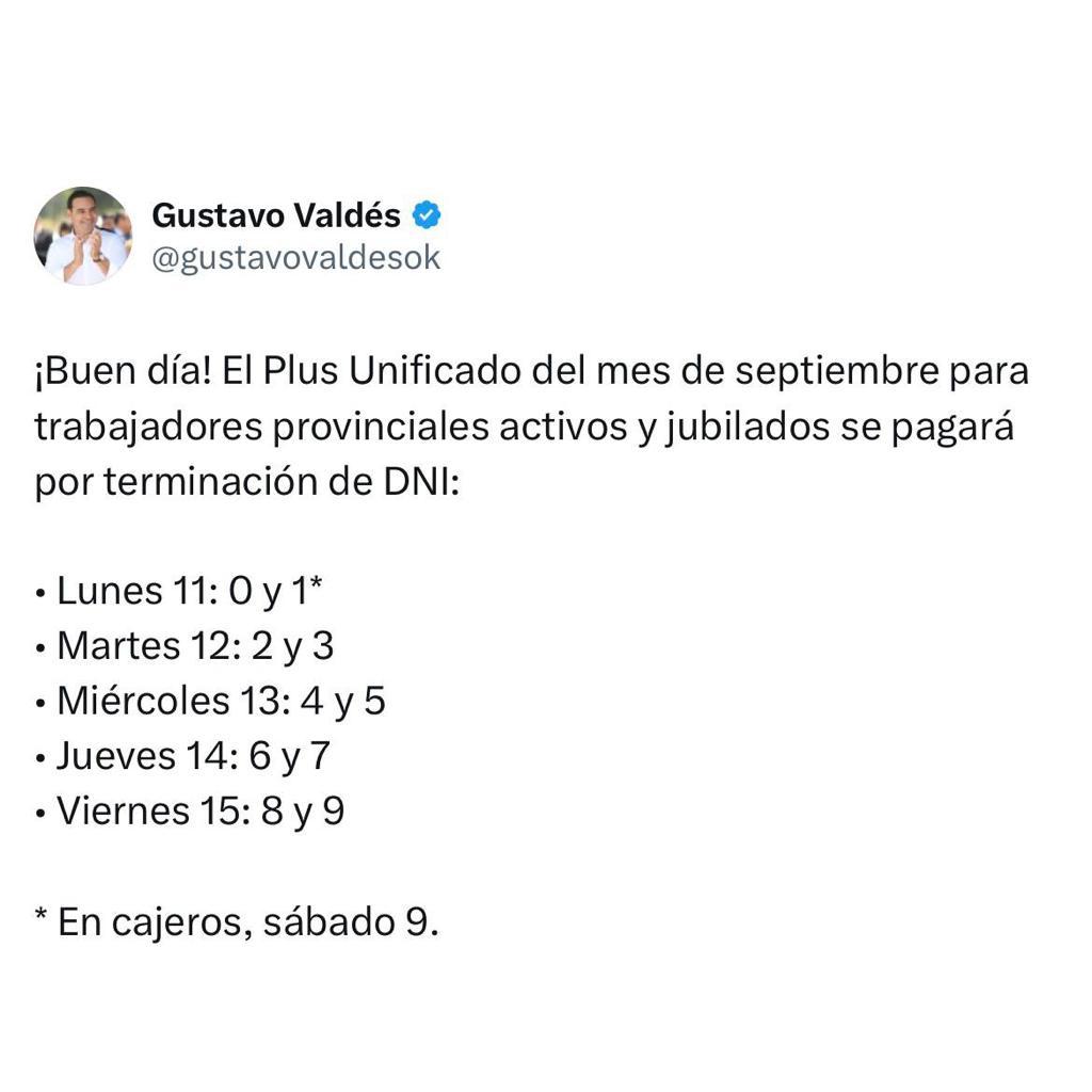 Asimismo, se informó que el próximo lunes se comienza a pagar el Plus. (Ver imagen).